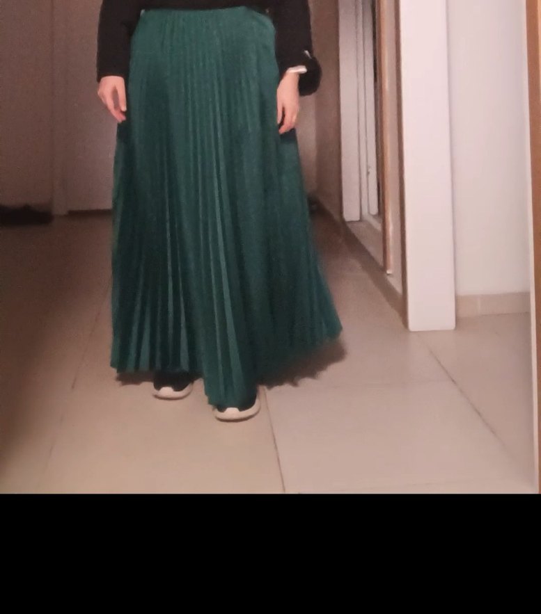 Koyu yeşil, piliseli ve bol kesim uzun etek. Sentetik kumaştan, sade ve mütevazı tarz için uygundur.