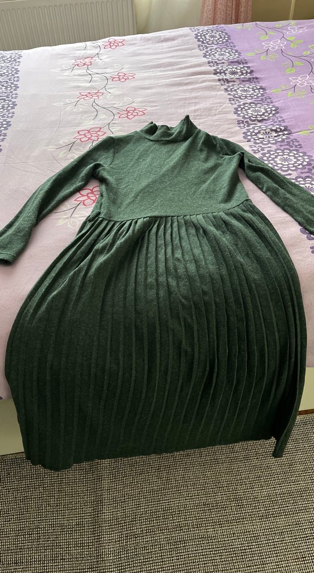 Uzun kollu, keten kumaştan yeşil piliseli ve boğazlı, vücuda oturan uzun elbise, günlük kullanım için uygundur.