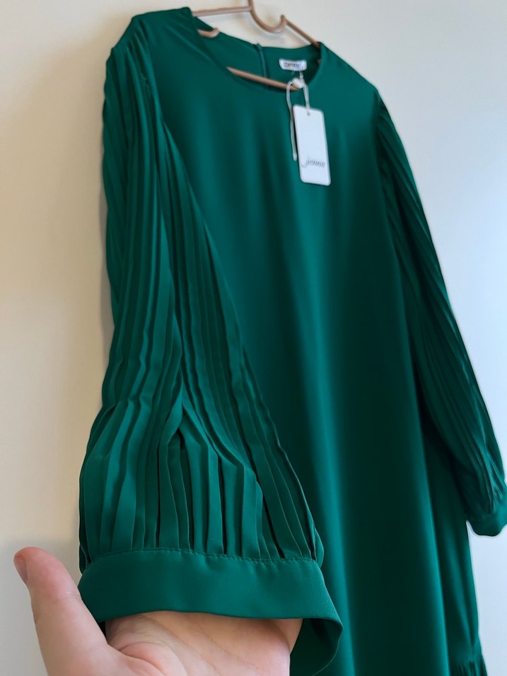 Yeşil renkte, piliseli uzun kollu, yuvarlak yaka, sentetik kumaştan yapılmış, Minimalist ve ofis stiline uygundur.