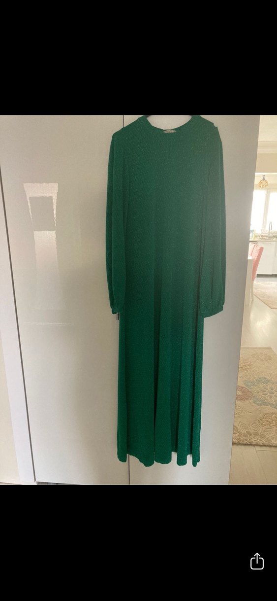 Koyu yeşil renkte, uzun kollu ve yüksek yakalı piliseli uzun elbise. Düzenli kesim, minimalist ve sade tarzda, günlük kullanıma uygun. 40 bedendir ama 42 bedene kadar olabilir acil satılıktır