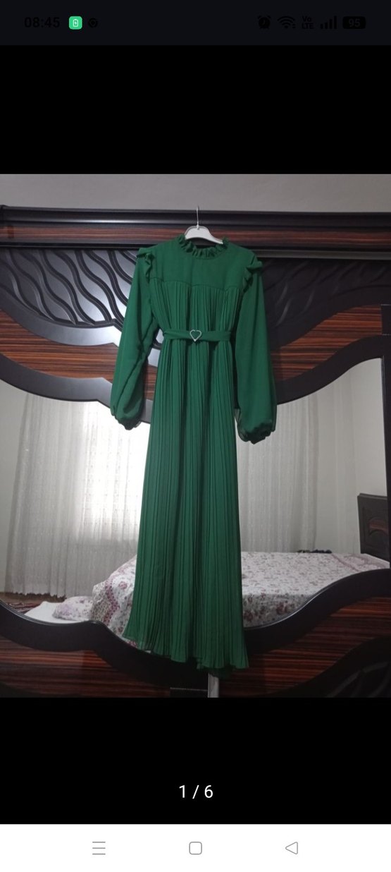 Yeşil Piliseli Uzun Kollu Uzun Elbise