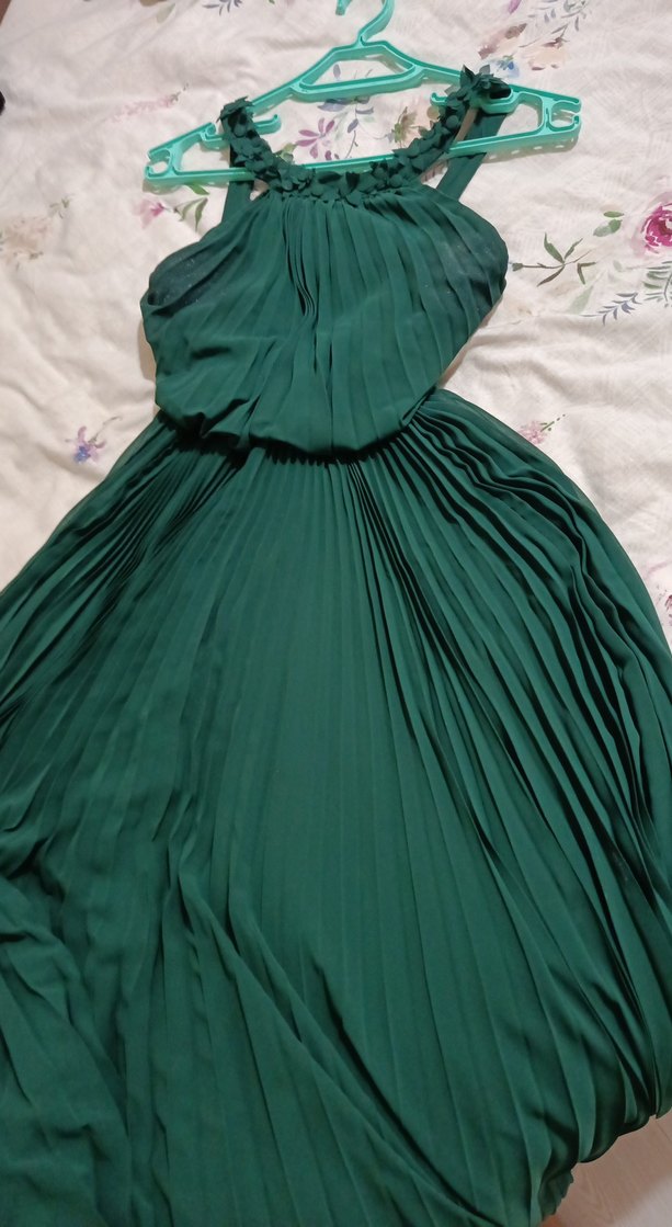 Koyu yeşil renkte, askısız yaka ve piliseli, sentetik kumaştan yapılmış, bol kesim bohem tarzda uzun elbise.