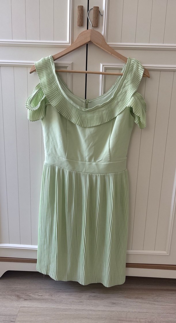 Yeşil pastel renkte, tek parça piliseli, kayık yaka ve kolsuz vintage midi elbise. Parti için uygun, vücuda oturan model. Etiketli ufak iplik sarkmaları var.