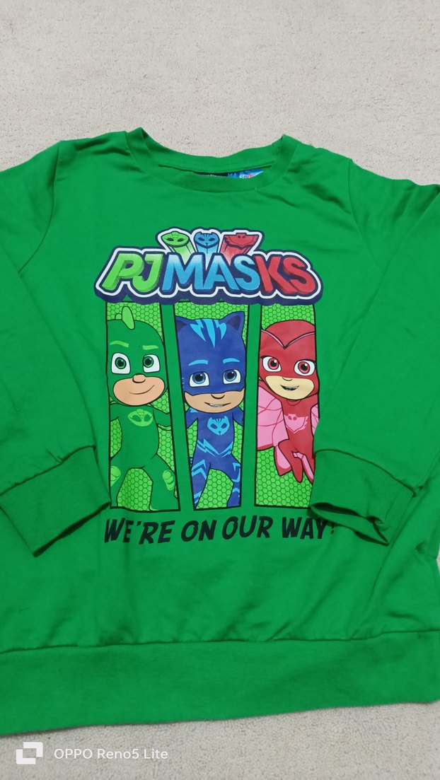 Yeşil renkli, Pijamaskeliler baskılı LCW marka sweatshirt. Uzun kollu, yuvarlak yakalı ve bol kesimdir.