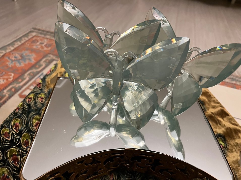 Bu biblo, ince kesim kanatlara sahip açık yeşilkristal kelebek tasarımına sahiptir ve zarif, yansıtıcı bir görünüm sunar.