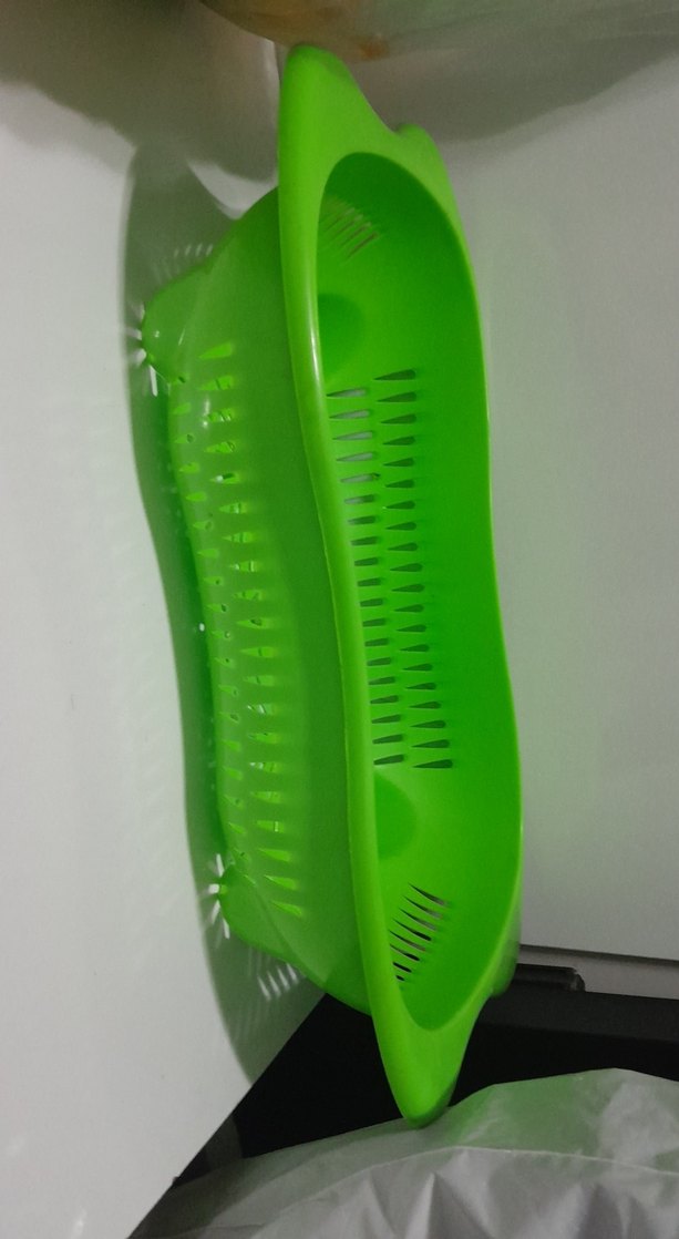 Canlı yeşil renkte, yiyecekleri süzmek ve durulamak için kullanılan plastik süzgeç.