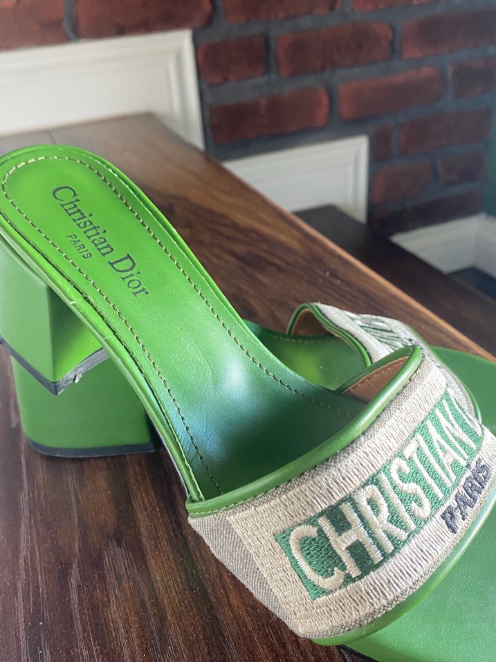 Yeşil platform topuklu terlikler, baskılı kumaş kayış ve tokalı detaylar içerir. Parlak kauçuk taban ve Christian Dior logosu ile vintage, avant-garde tarz sunar. Butiğimizden kalan ürünlerdendir,37-40 arası numaraları bulunmaktadır