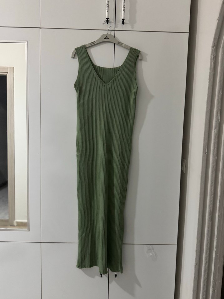 Keten kumaştan, yeşil tonlarında, v yaka ve pliseli detaylı, kolsuz ve uzun kesim, vücuda oturan elbise.