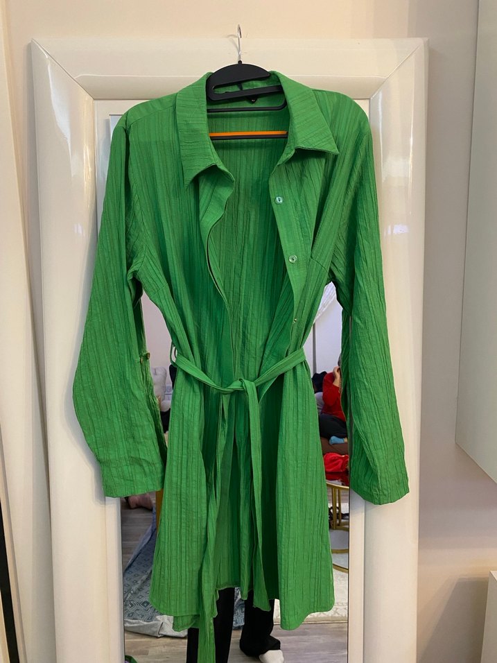 Yeşil Pliseli Uzun Keten Kadın Gömlek