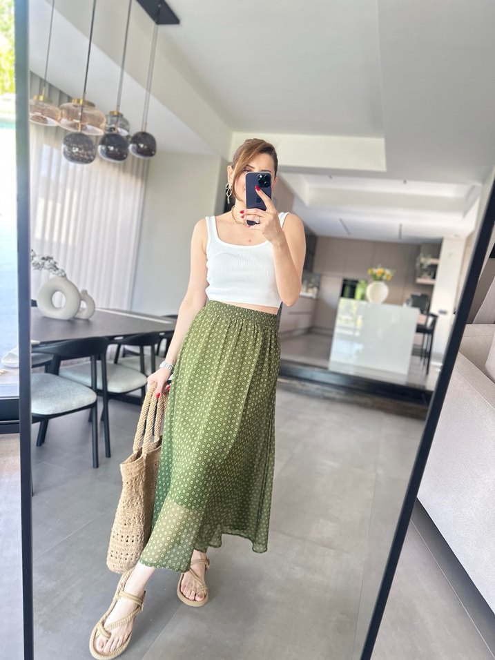 Yeşil Puantiyeli Astarlı Tül Uzun Etek