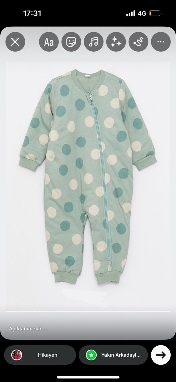 Pastel yeşil renkte, puantiyeli ve fermuarlı, yumuşak ve sıcak kumaştan bebek tulumu. Street wear tarzında tasarlanmıştır. ❄️ Tog değeri : 2,5 tog