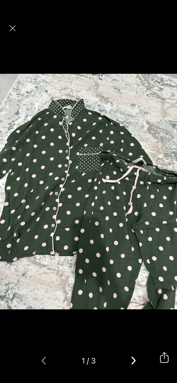 Kadınlar için bol kesim, midi boy ve uzun kollu pijama takımı. Koyu yeşil üzerine beyaz puantiyeli, düğmeli gömlek ve bağcıklı pantolon. Rahat ve bohem tarzda.
