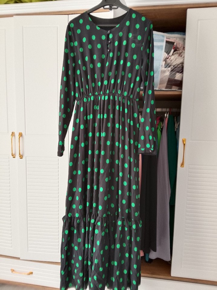 Uzun, yeşil puantiyeli elbise, bol kesim ve uzun kolludur. Sentetik kumaş, fırfır detaylı ve yuvarlak yakalıdır. Bohem tarzına uygundur.