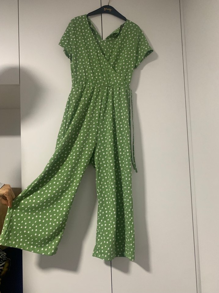 Yeşil renkli, v yaka ve kısa kollu, bol kesim tulum. Belden kemerli ve pastel puantiyeli desene sahip, günlük kullanım için uygun.