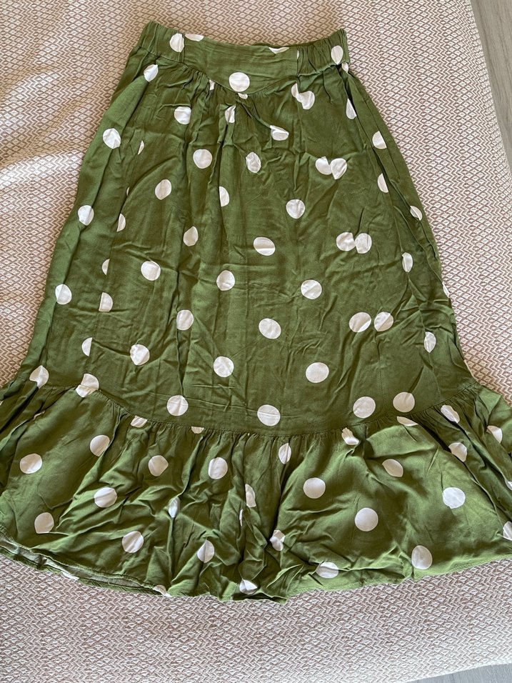 Uzun, yeşil renkli etek, beyaz puantiyeler ve volan detayına sahiptir. Bol kesim ve parlak sentetik kumaştan yapılmıştır, bohem tarz için uygundur.