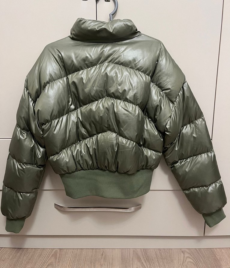 Yeşil renkte, dar kesim kadın kışlık mont, puflu tasarıma ve boğazlı yaka sahiptir.