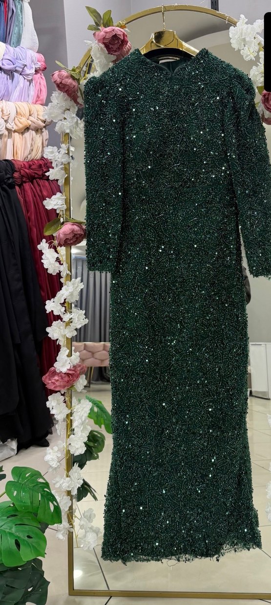 Yeşil renkli, uzun kollu ve pullu detaylı abiye elbise. Notlu yaka ve desenli yapısıyla düğün gibi özel günler için uygundur. ✨ 36 40 uyumlu