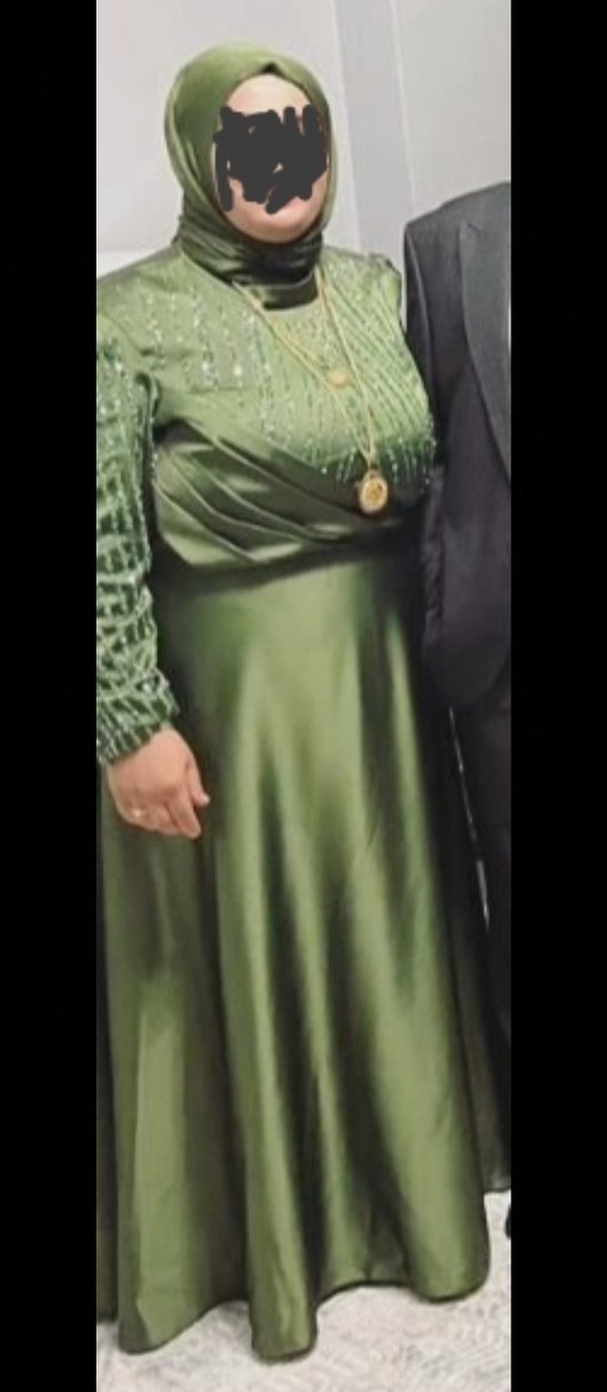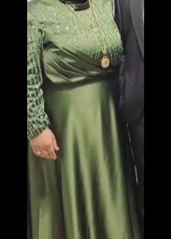 Yeşil parlak kumaştan, uzun kollu, yüksek yakalı ve drapeli, bol kesim abiye elbise. Modern klasik tarzda, düğünler için uygun.