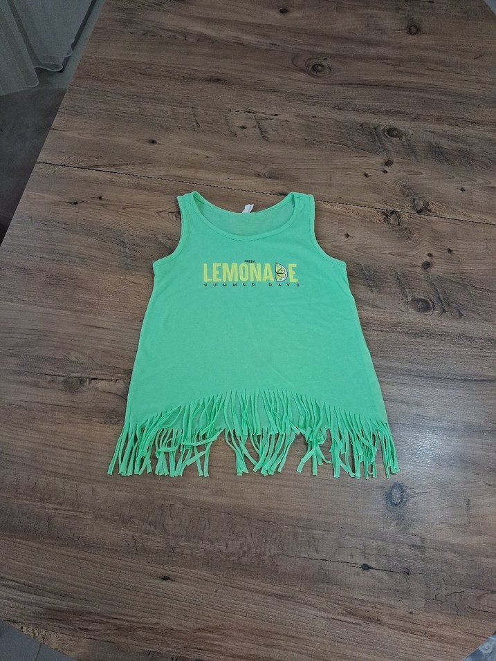 9 yaş defacto ön tarafında belli olmayan leke var renkli baskılı yazılı, yeşil kolsuz kız tişörtü. Alt kısmında püskül detayları bulunur. Yumuşak ve sıcak kumaştan, bol kesim ve yuvarlak yaka ile.