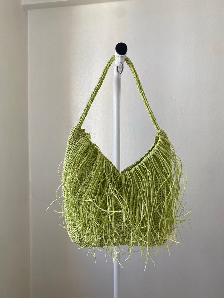 Yeşil renkli, püsküllü detaylara sahip örgü kadın çanta. Bohem tarzıyla günlük kullanıma uygundur, pastel tonu ve minimalist stili trendsetter'lar için ideal.