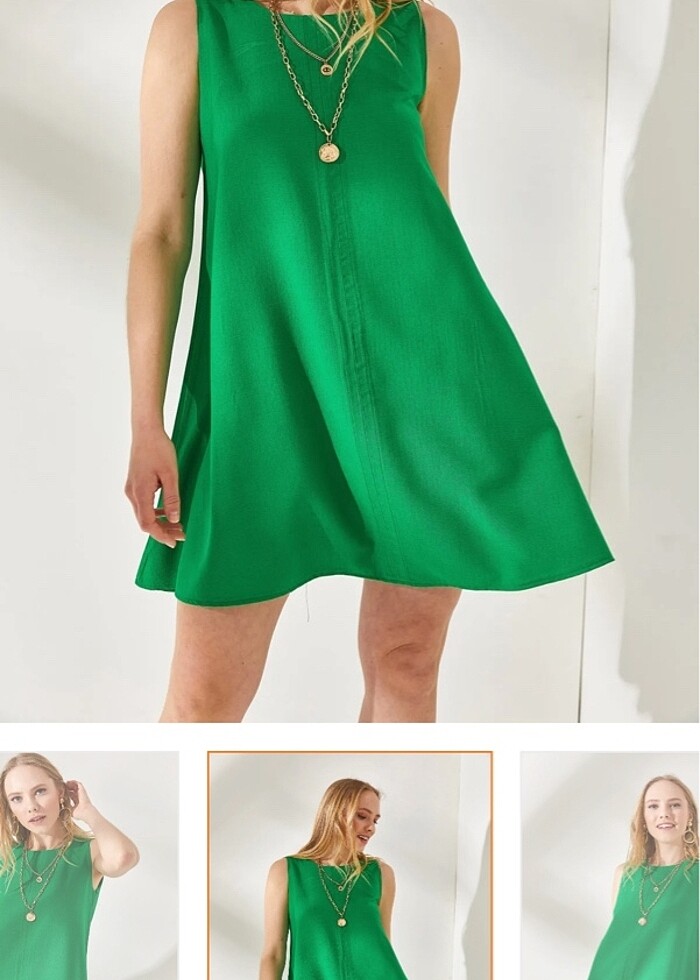 Canlı yeşil renkli A kesim elbise, hiç giyilmedi etiketi üstündedir.