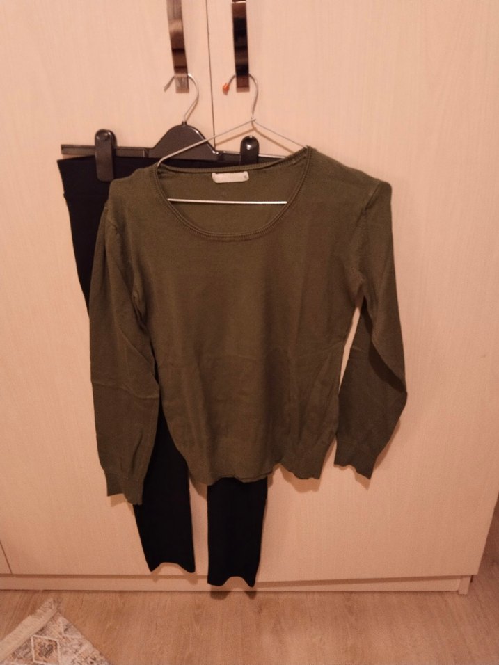 yeşil kadın triko, yuvarlak yaka ve uzun kolludur. Pamuklu yumuşak kumaştan, bol kesim ve normal boydadır. Günlük rahat sokak stili için uygundur.