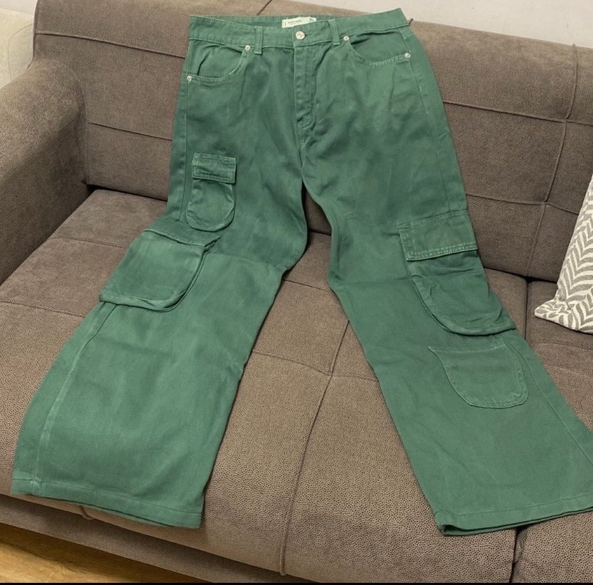 Yeşil renk, rahat kesim olan bu kadın kot pantolon, çoklu cepleriyle outdoor kullanıma uygundur ve şık bir görünüm sunar.