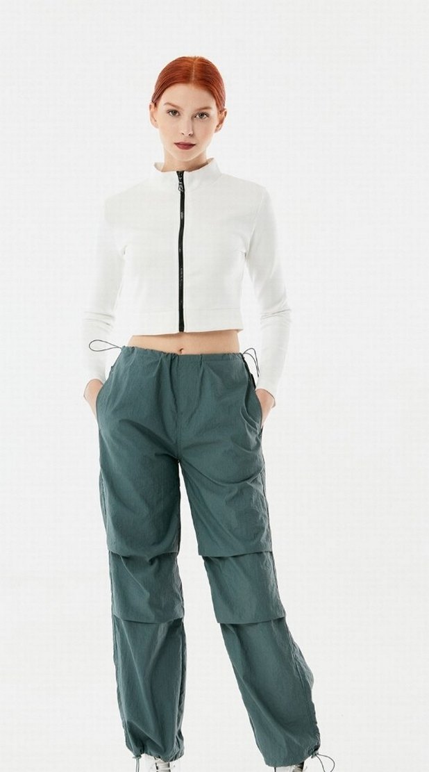 Yeşil sentetik kumaştan, rahat kesimli kadın pantolonu. Sokak stiline uygun, dış mekan kullanımı için ideal rahat tasarım.