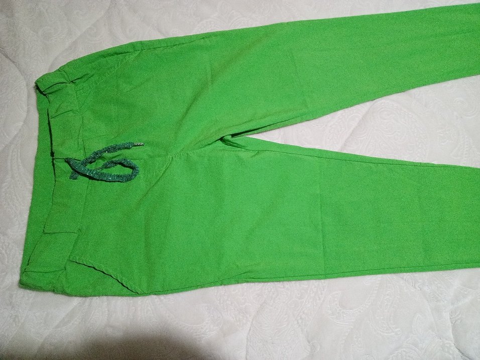 Yeşil renkte, rahat kesim, fermuarlı cepleri olan kadın kumaş pantolon. Yumuşak sentetik kumaştan, günlük ve sokak tarzına uygun.
