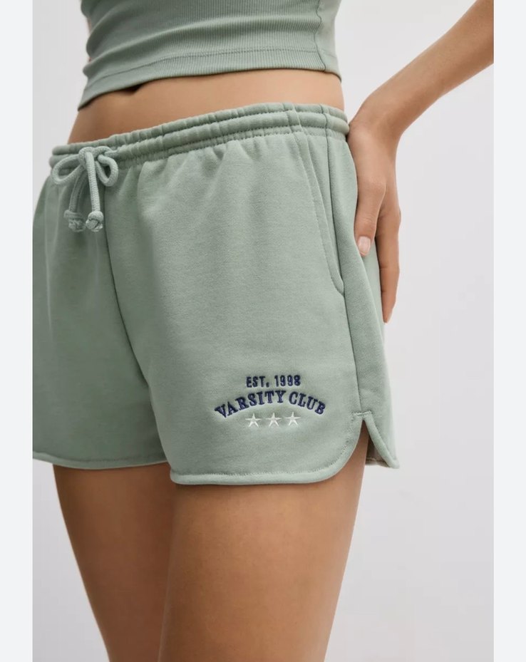 Yumuşak dokulu yeşil mini şort, rahat kesim ve baskılı varsity club detayıyla. Lastikli bel ve yan cepler içerir. Pastel tonlarda gündelik sokak stili. İnditex/ lefties marka