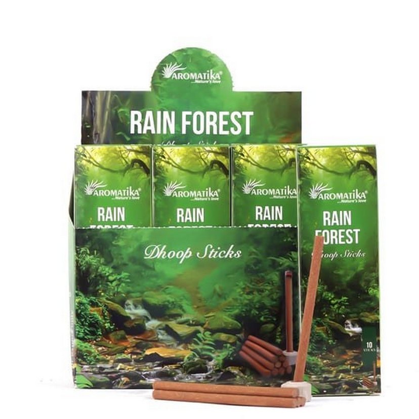 Aromatika'nın yeşil renkli, rainforest kokulu koyu yeşil Dhoop çubukları, doğal ve sakinleştirici bir koku sunar. paket içinde 10 adet dhoop tütsü bulunmaktadır.