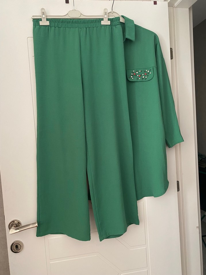 Yeşil renkli, uzun kollu, bol kesim kadın takım.Göğüs ceplerinde nakış detayları ve düğmeli kapama bulunur. Notlu yaka ve yumuşak sentetik kumaştan üretilmiştir.