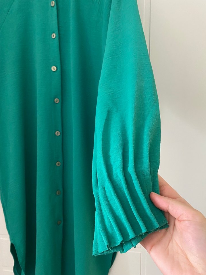 Parlak yeşil renkte, düğmeli önü, uzun kolları ve toplanmış manşetleri olan uzun tunik. Sentetik kumaştan, bol kesim ve rahat sokak stili için uygun.