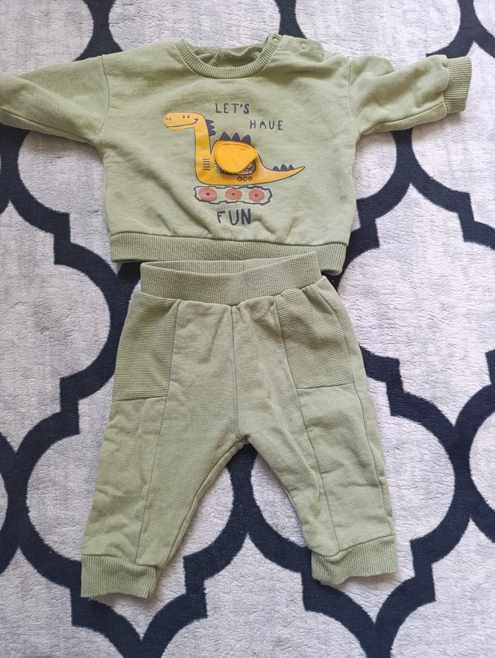 yesil renkli, uzun kollu, yuvarlak yaka örme sweatshirt ve pantolondan oluşan bebek erkek takımı. Üzerinde "Let's Haue Fun" yazılı sevimli dinozor baskısı bulunur. Yumuşak ve sıcak tutan kumaştan yapılmıştır. 1-3 ay için uygun az kullanildi