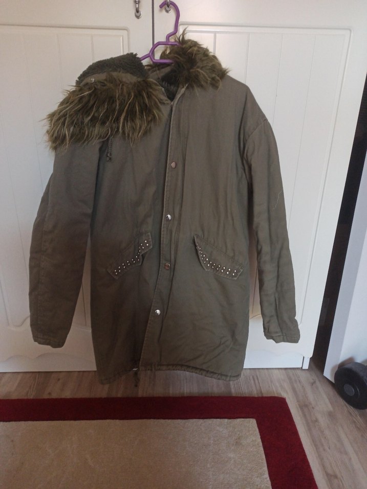 haki renkte midi uzunlukta, kürklü yakalı ve uzun kollu, yumuşak ve sıcak kumaştan rahat kesim kadın ceket. Günlük kullanıma uygundur.