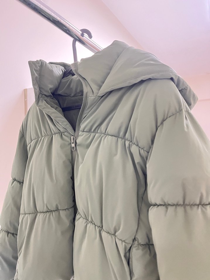 Yeşil renkli, fermuarlı ve yüksek yakalı kadın kışlık mont. Rahat kesimi ve askılı kolları ile sokak stili için yumuşak sentetik kumaştan yapılmıştır. Midi boyda ve desensizdir.