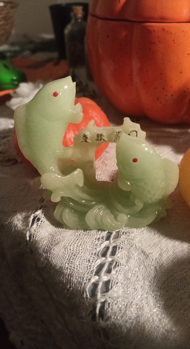 Kırmızı gözlü iki balığın dalgalar üzerinde sıçrıyormuş gibi durduğu yeşil renkli renkli figür. Bolluk bereket sembolü. hasarı yoktur