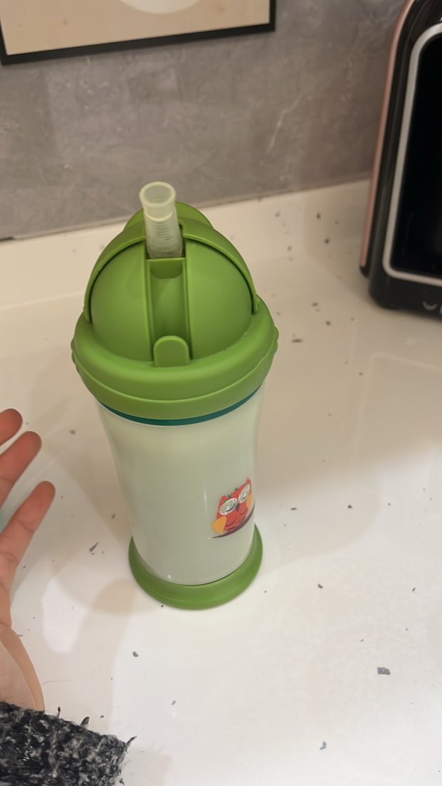 Renkli baykuş desenli, yeşil renkli, kapaklı ve pipetli bebek suluk.