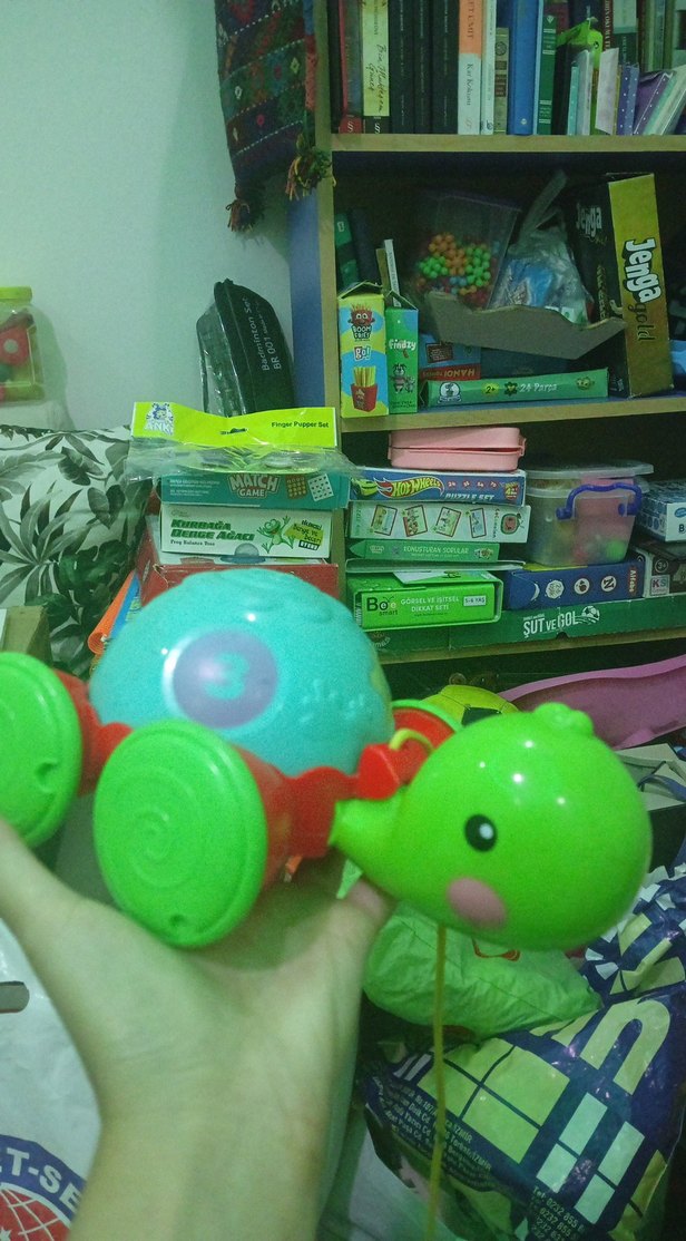 Tekerlekli, yeşil renkli kaplumbağa şeklinde çekmeli oyuncak. Üzerinde 'SUTGOL' yazısı bulunur.