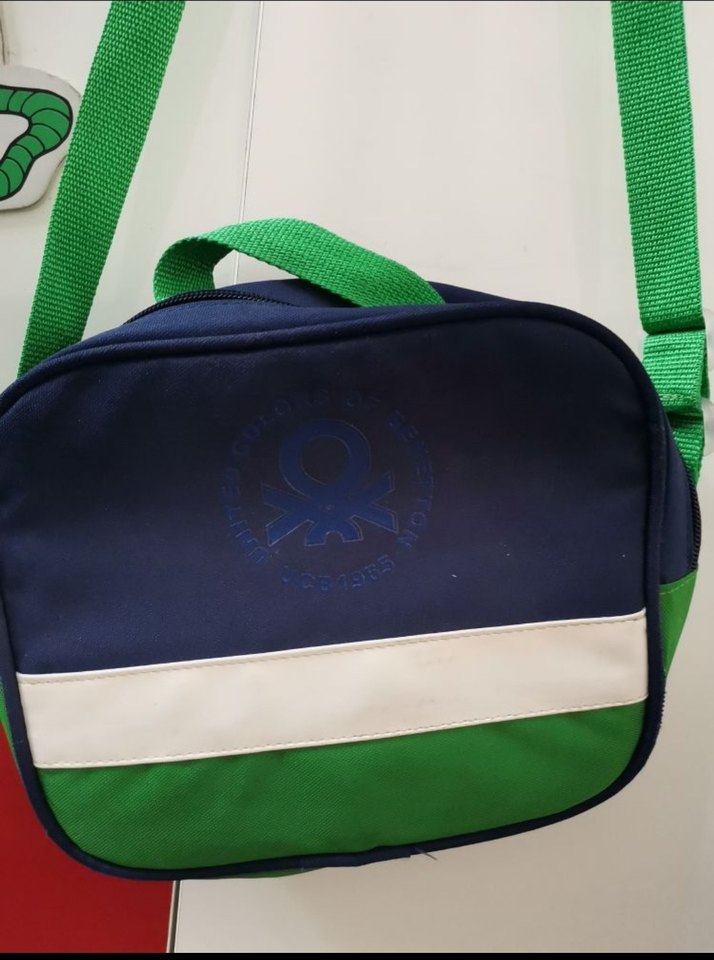 Yeşil ve lacivert renkli, önünde beyaz şerit bulunan, ayarlanabilir yeşil askılı çocuk okul çantası. Temiz kullanıldı, defosu kesinlikle yok