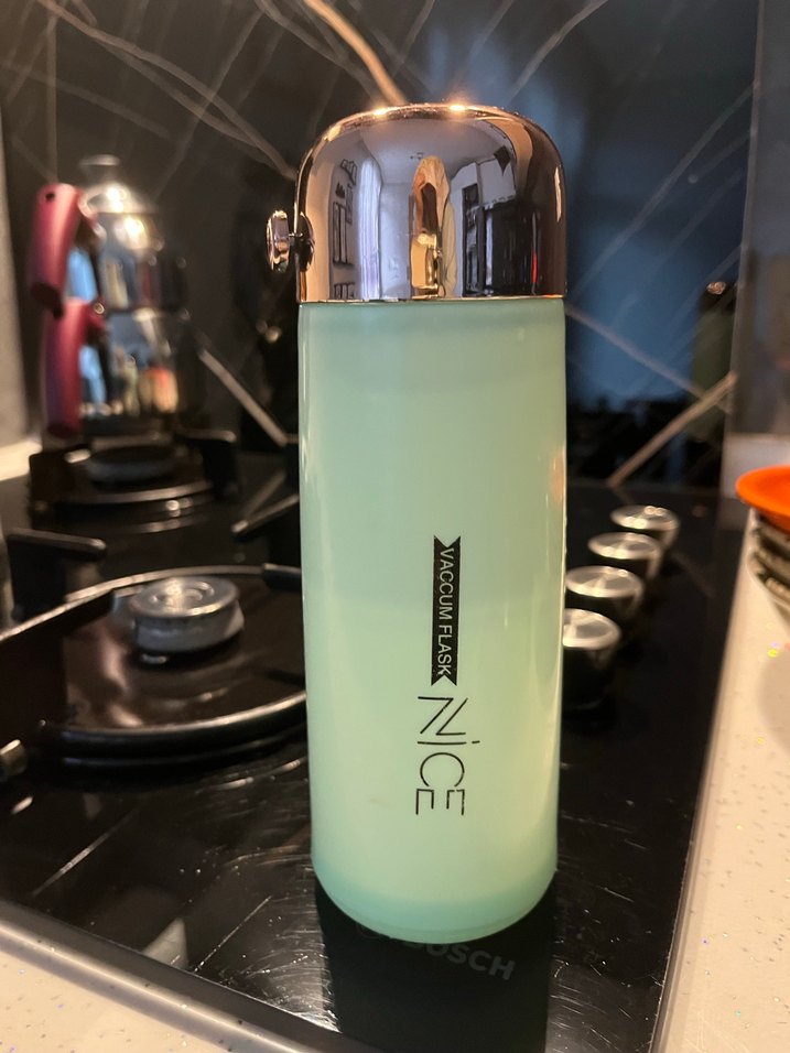 Işıltılı gümüş kapaklı, yeşil renkli çocuk termos şişesi. İçecekleri sıcak veya soğuk tutar, taşınması kolaydır.