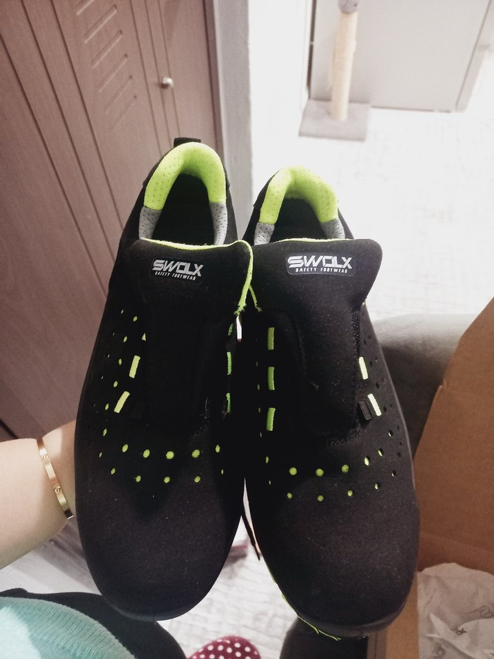 Yeşil renkli, baskılı desenli erkek iş güvenliği ayakkabısı kauçuk taban . Ayakkabılarda "SWOLX" yazısı bulunur.