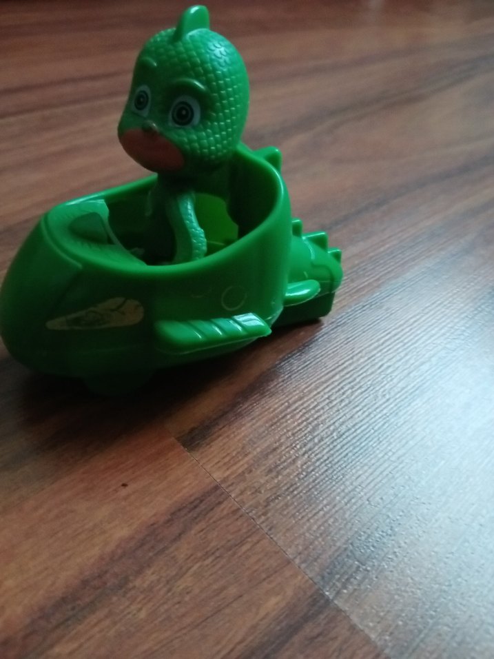 Renkli yeşil bir figür, uyumlu yeşil araç içinde oturuyor. Pürüzsüz, dayanıklı plastikten yapılmıştır. Hayal gücünü destekler.