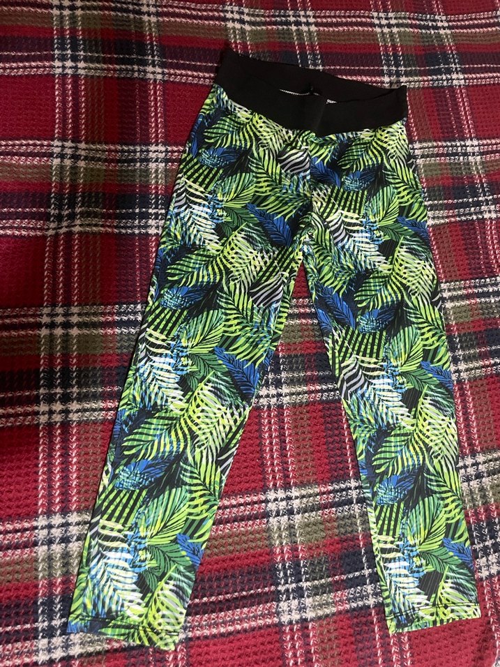 Canlı yeşil yaprak desenli, sentetik kumaştan, elastik bel bantlı, fit kesim kadın pantolon, dış mekan rahatlığı için uygundur.