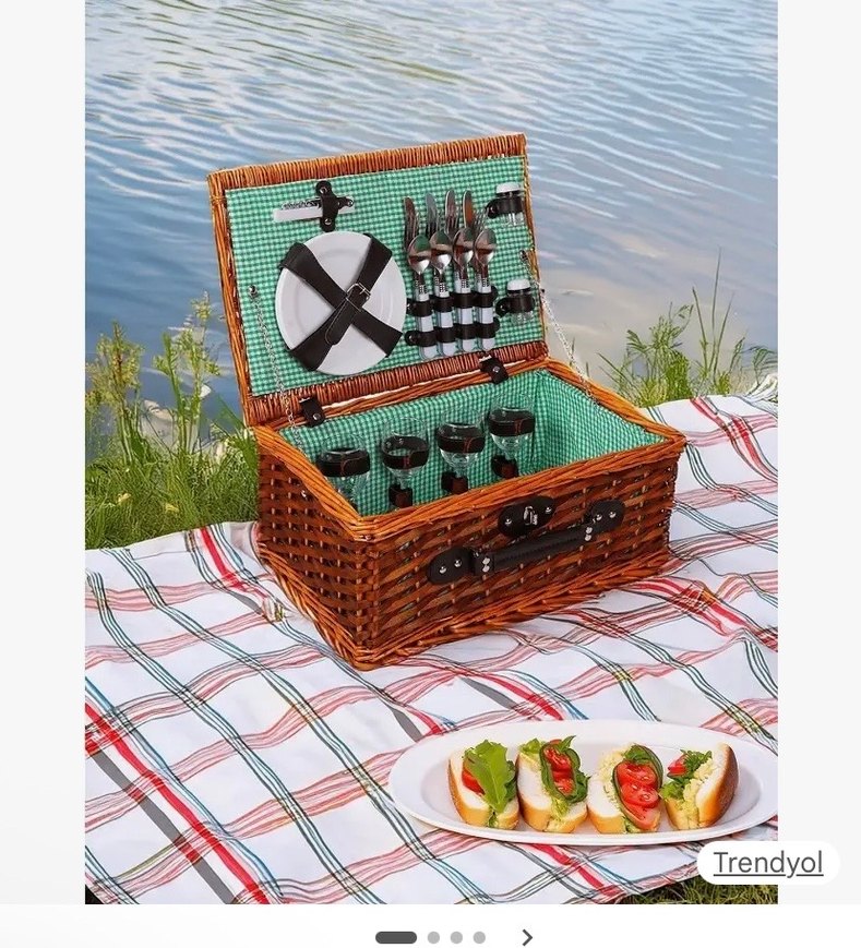 Yeşil renkli hasır piknik sepeti, içinde tabaklar, çatal-bıçak ve bardaklar bulunur. Kareli iç tasarıma ve klasik kilit mekanizmasına sahiptir. ️orijinal perotti 4 kişilik piknik seti sepeti. 1 kez kullanıldı kusursuz