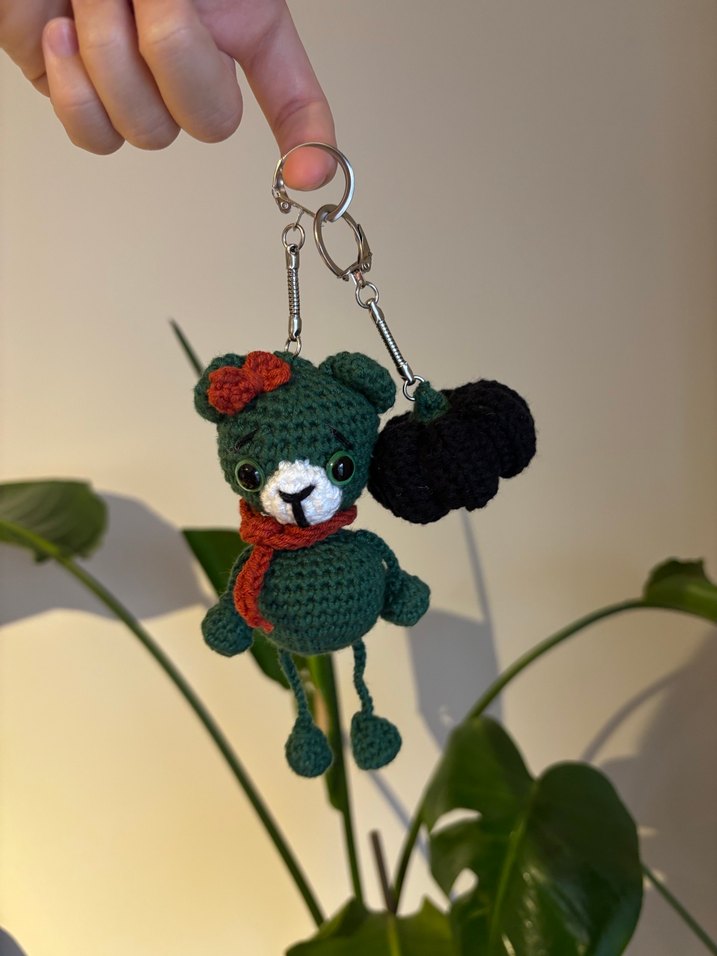 Renkli kadın anahtarlık, örgü yeşil ayıcık ve siyah kabak detaylıdır. İsteğe göre birlikte ya da ayrı ayrı kullanılabilir.