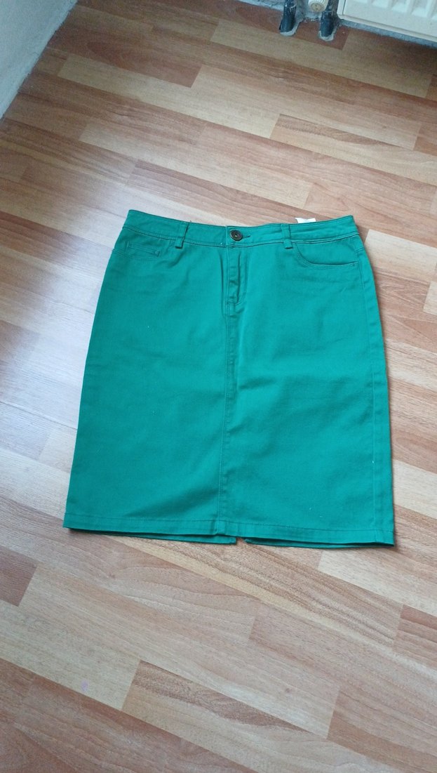 Yeşil renkte denim kumaştan üretilmiş, günlük kullanıma uygun düz kısa etek.