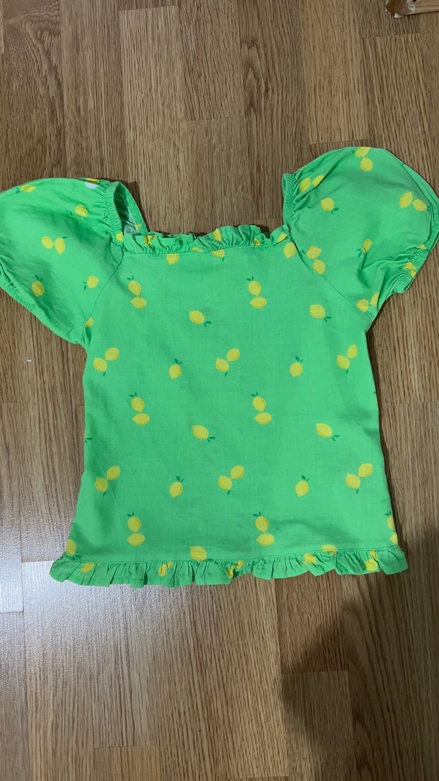 Yeşil renkte, kısa puff kollu, fırfırlı detaylı ve renkli baskılı desenli bluz. Arka kısmı lastikli yaka ve etek ucu fırfırlıdır. Tek kusuru arka kısmında çamaşır suyu lekesi mevcut onu da çekip koydum ona göre fiyat verdim. Çok belli de olmuyor resimlerde görüldüğü gibidir. 8-9 yaş ama 7 yaşa çok rahat olur dar kesimdir.