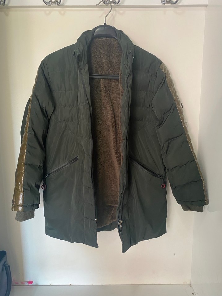 Yeşil renkli , kürklü detaylı erkek çocuk mont, bol kesim ve notched lapel yakaya sahiptir. İç kısmı yumuşak ve sıcaktır, sokak stili için uygundur.