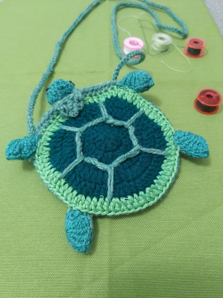 Yeşil renkli, kaplumbağa desenli örgü bebek çanta, yumuşak iplik örgü